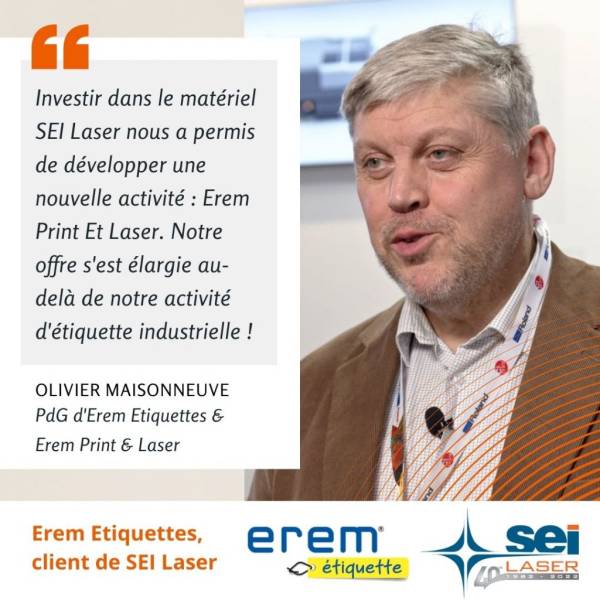 D’après Olivier Maisonneuve, PDG de Erem Etiquette et Erem Print & Laser, son investissement a permis de développer une nouvelle entité capable de fournir à une clientèle plus large des produits orientés communication (carte de voeux, invitation, etc.), pour des volumes pouvant aller de la petite à la grande série.